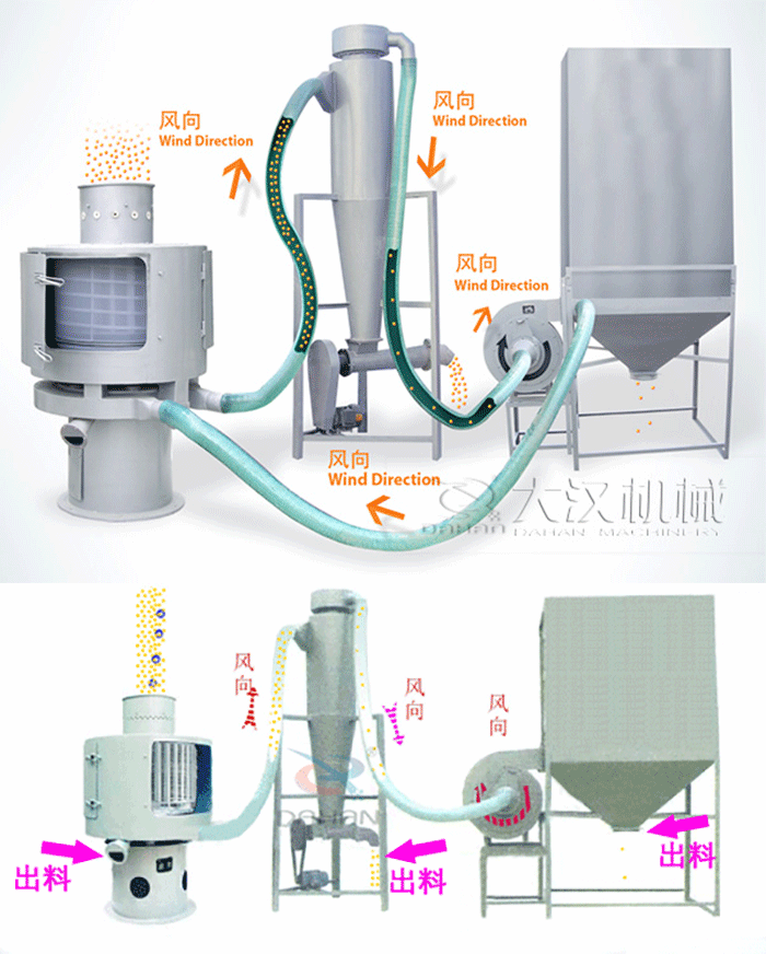 氣流篩由電機、機座、篩箱、進出料推進裝置等部分組成的。其篩網為圓筒狀,置于機體內,作業時物料不是直接投放到篩體內,而是經由一截螺旋輸送機送入,篩箱內的分流葉片高速連續轉動,將送入的物料吹起沖向圓筒狀的篩網,細料透過篩網進入成品儲料室,粗料從出料口流出。