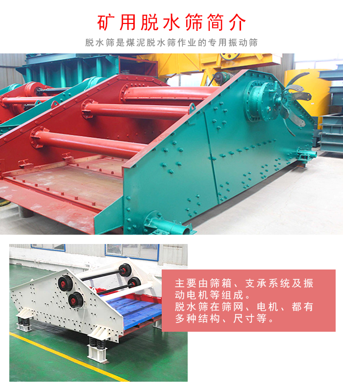 礦用脫水篩是煤泥脫水篩作業的專用振動篩,結構上主要由篩箱、支承系統及振動電機等組成。